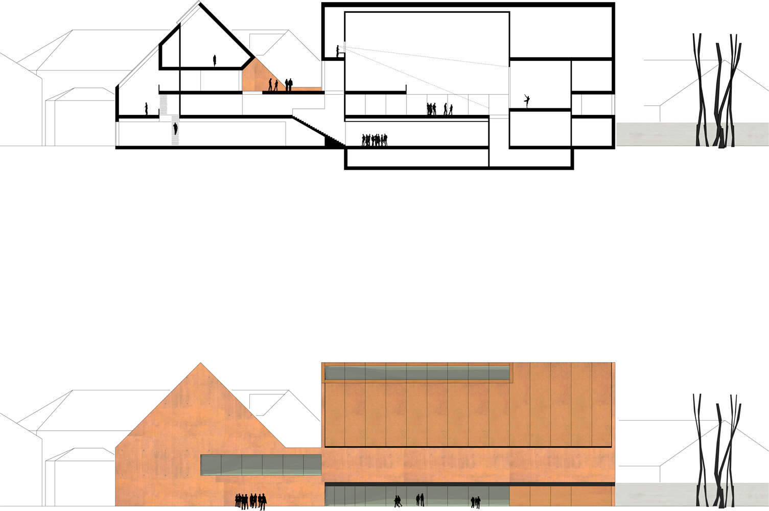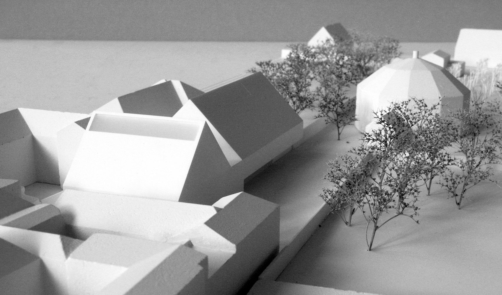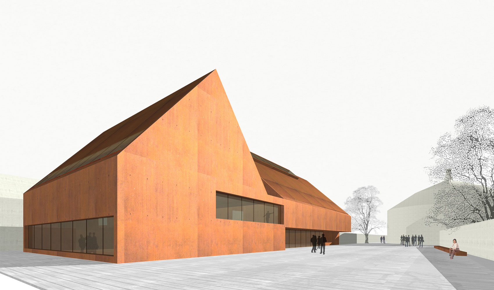 Kapellplatz-Kulturzentrum-Panorama. Dieser Verbindungslinie entsprechend artikuliert sich das neue Kulturzentrum als längsgerichtetes Gebäude mit davor liegendem angerartigem Platz. Die Dachlandschaft greift die traditionellen bauplastischen Elemente der Stadtstruktur auf und übersetzt sie in eine zeitgenössische Formensprache. Zugleich kommuniziert die Dachlandschaft mit ihren senkrecht zueinander stehenden Satteldächern die innere Organisation des Hauses, die sich in ein festliches Haus mit Saalbereich, dem Kulturzentrum und in ein Bürgerhaus mit gemeindebezogenem Dienstleistungsbereich, Bibliothek und Proberäumen für die Musikkapelle gliedert.