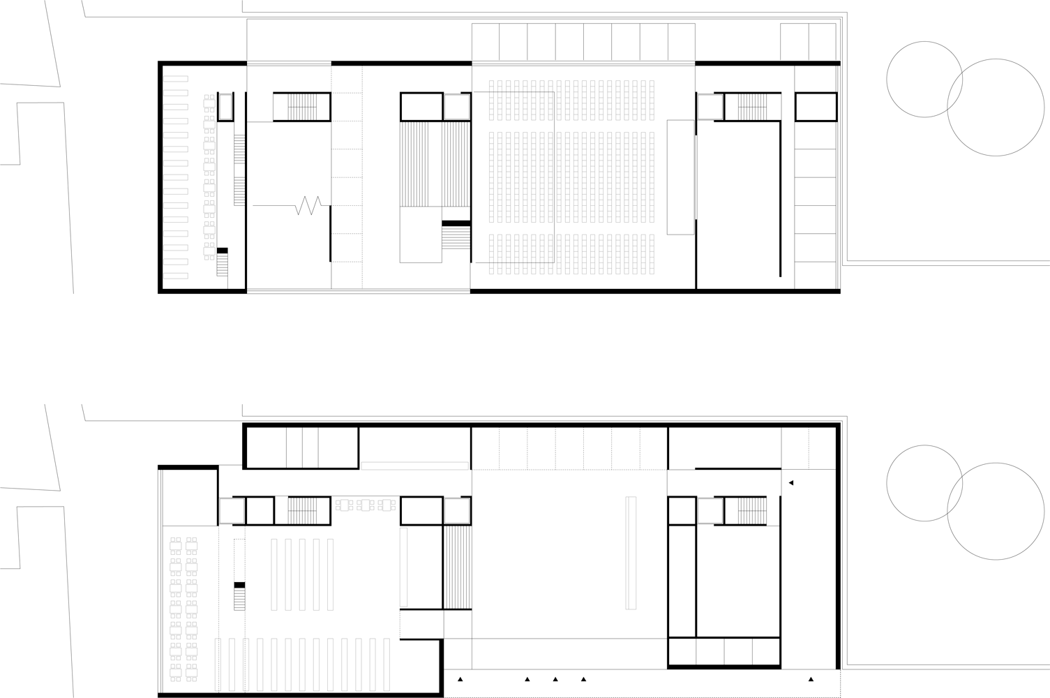 Ein grosszügiges Foyer unter dem Längsbau empfängt die Besucher auf Platzniveau. Der große Saal und der Tagungsbereich liegen jedoch bewusst darüber und noch höher angeordnet. Diese Staffelung und Verteilung der unterschiedlich ausgebildeten Foyer- und Aufenthaltsflächen sollte auch dazu verführen, durchs Haus zu wandeln.