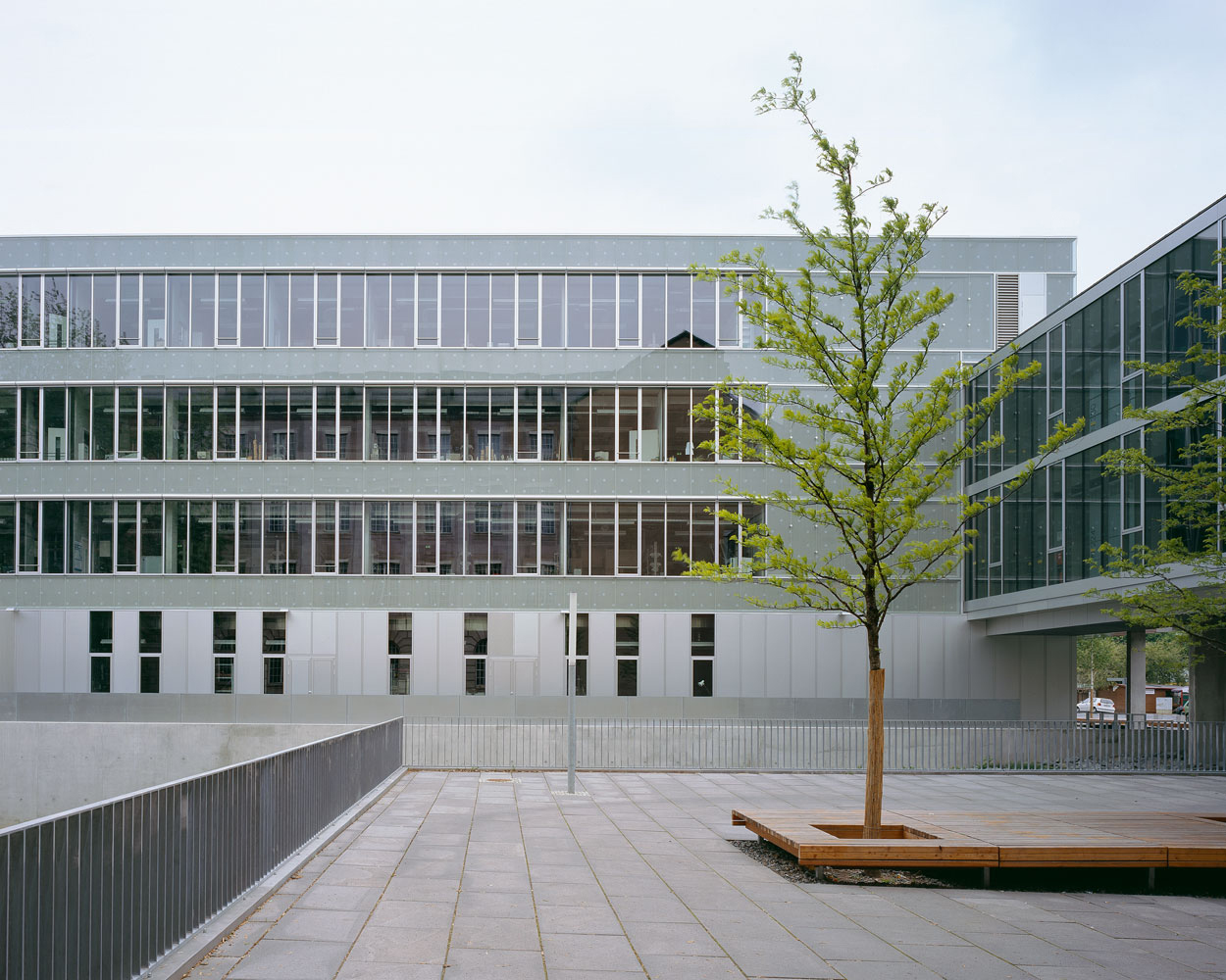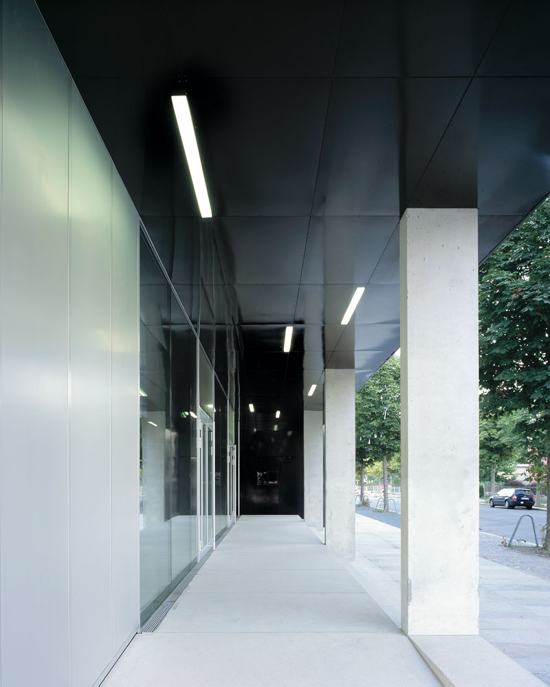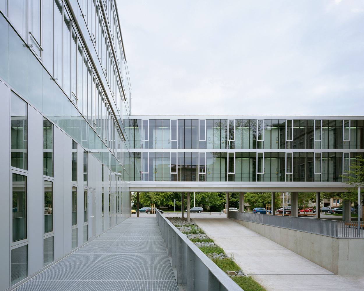 Der Erweiterungsbau für Ingenieur- und Naturwissenschaften fasst als Laborgebäude die Ausbildungsbereiche Chemie, Physik und Bauingenieurwesen der HTW Dresden an einem Standort zusammen. Der L-förmige Baukörper entwickelt sich als schmaler 1-Bund zum 2-Bund mit dazwischenliegendem zentralem Atrium. Entlang der Schnorrstraße ist das Haus aufgeständert und gewährt damit freien Durchgang zum dahinterliegenden Hof. Zentrum des Gebäudes ist der zentrale Erschließungsraum, der sich über alle Geschosse erstreckt. Alle Bewegungen des Hauses werden hier gebündelt. Das "Herz" des Hauses ist der Experimentierhörsaal, der direkt neben dem Haupteingang liegt. Im Gegensatz zum graphischen und in den Eigenfarben der Materialien belassenen Farbkonzept der Erschliessungs – und Laborräume zeigt sich der Hörsaal als einziger Raum in Farbe. Die Fassade wurde als Bandfassade konzipiert. Ihre schmalen stehenden Elemente sind eingebettet in das Raster der geätzten Glashaut des Gebäudes, wodurch sich der Eindruck von unterschiedlichen Graden an Transparenz und Transluzenz einstellt. Je nach Lichteinfall sorgt die Schichtung und Tiefe der Ganzglasfassade für eine nuancierte Veränderung des Erscheinungsbildes des Gebäudes.