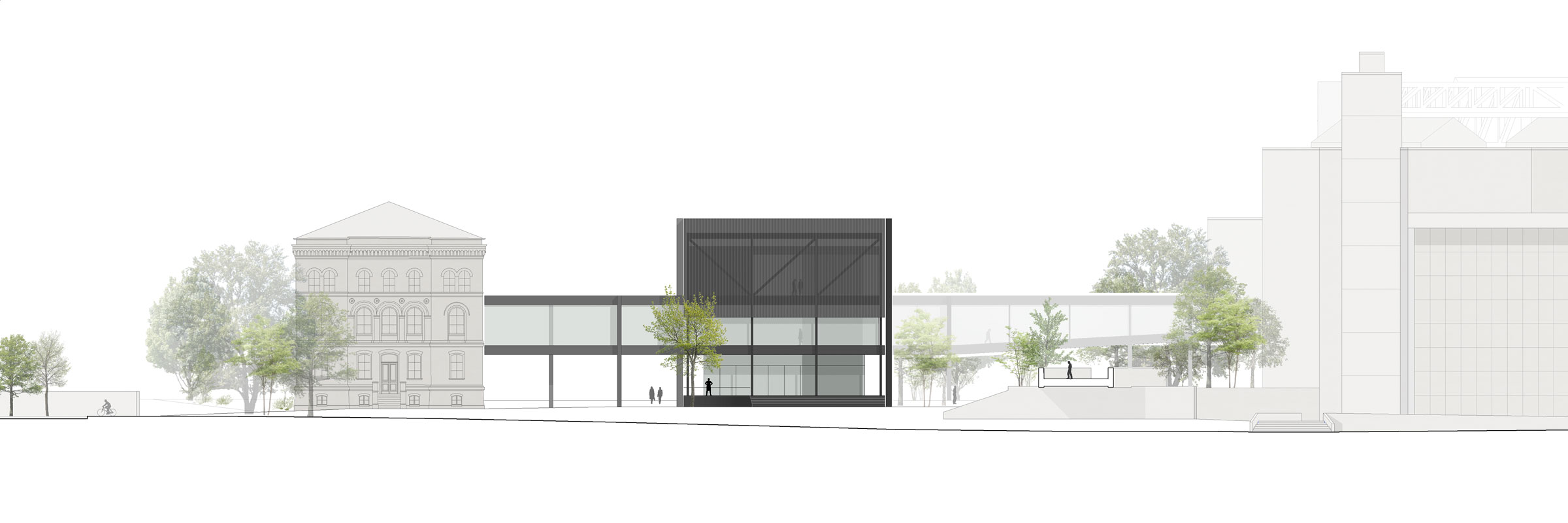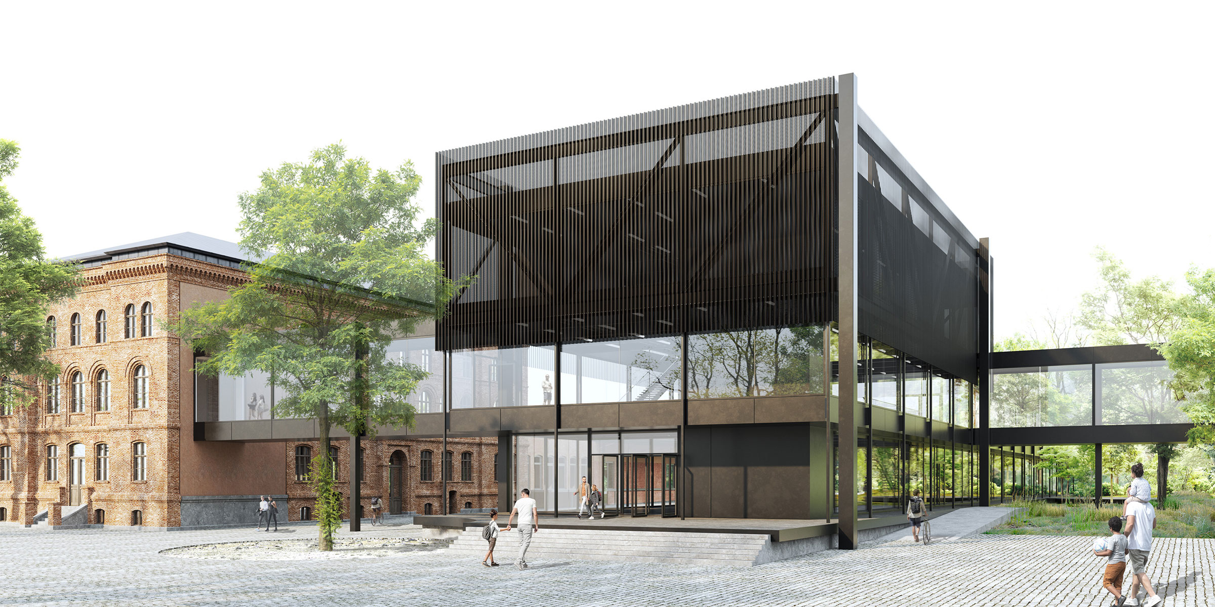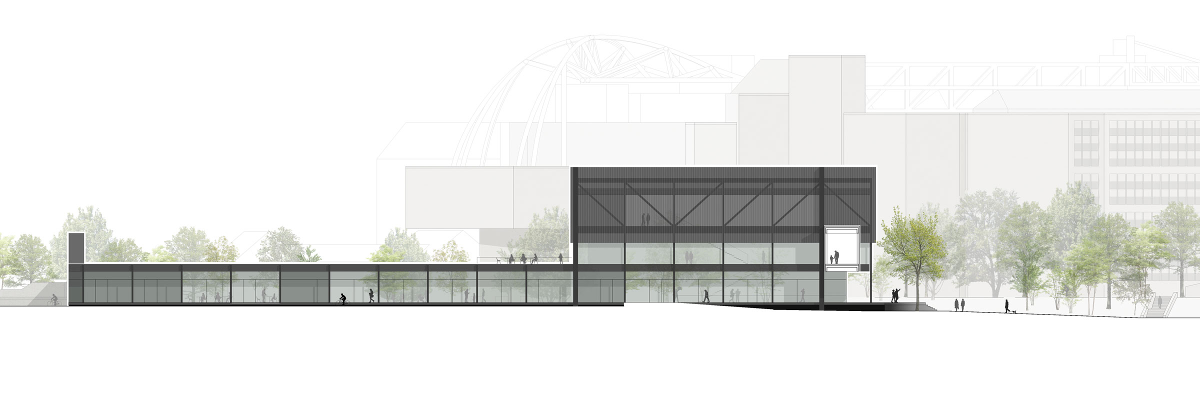 Gesucht wurde ein zwischen DTMB und Schwechtenbau vermittelnder Eingang, also kein drittes Haus. Die Charakteristika beider Häuser sind im neuen Eingangsgebäude wiederzufinden. Die städtebauliche und architektonische Gliederung der ehemaligen Bahnhofsanlage ebenso wie die erlebbare, identitätsstiftende Stahlkonstruktion des DTMB. Die Farbe Schwarz der tragenden Stahlkonstruktion und der hüllenden Bauteile vereint in der Pigmentmischung alle Farben, die schon da sind. Das Rot und Grau des DTMB, das Ziegelgelb des Schwechtenbaus, das Grün des Parks und die unendlich vielen Farben der Stadt.