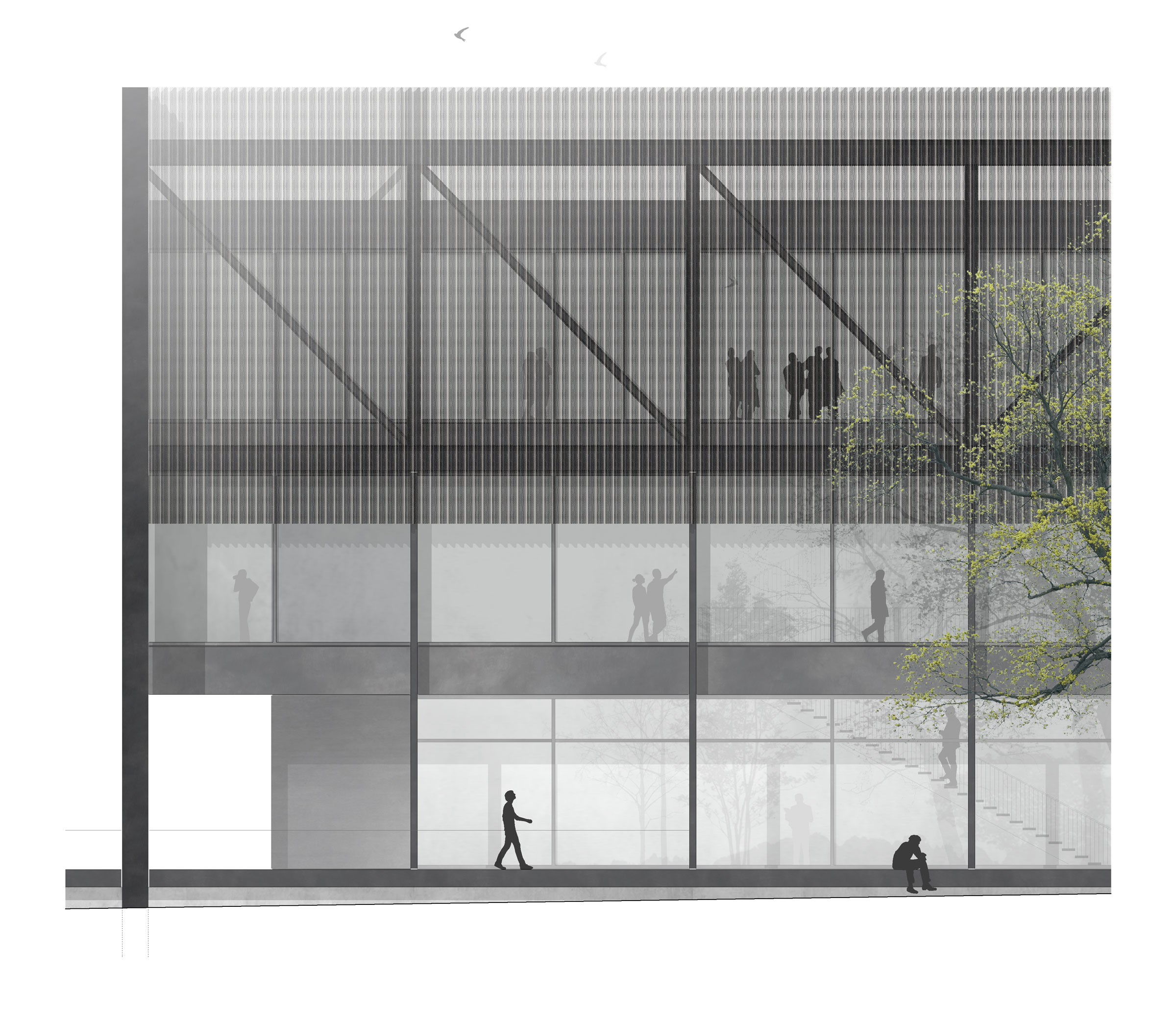Der heiteren Stimmung des urbanen, mit seinen überwucherten Gleisrelikten industriell geprägten Parkumfeldes, wird mit einer leichten, über dem Gelände schwebenden linearen Struktur geantwortet. Die Schwere und all zu ernste Themen werden vor der Tür gelassen. Eingebettet zwischen Park und Ladenzeile entsteht ein Pavillionhaus, das für Stammgäste und interessierte Besucher des DTMB der dritte Ort im Sinne Ray Oldenburgs sein könnte.